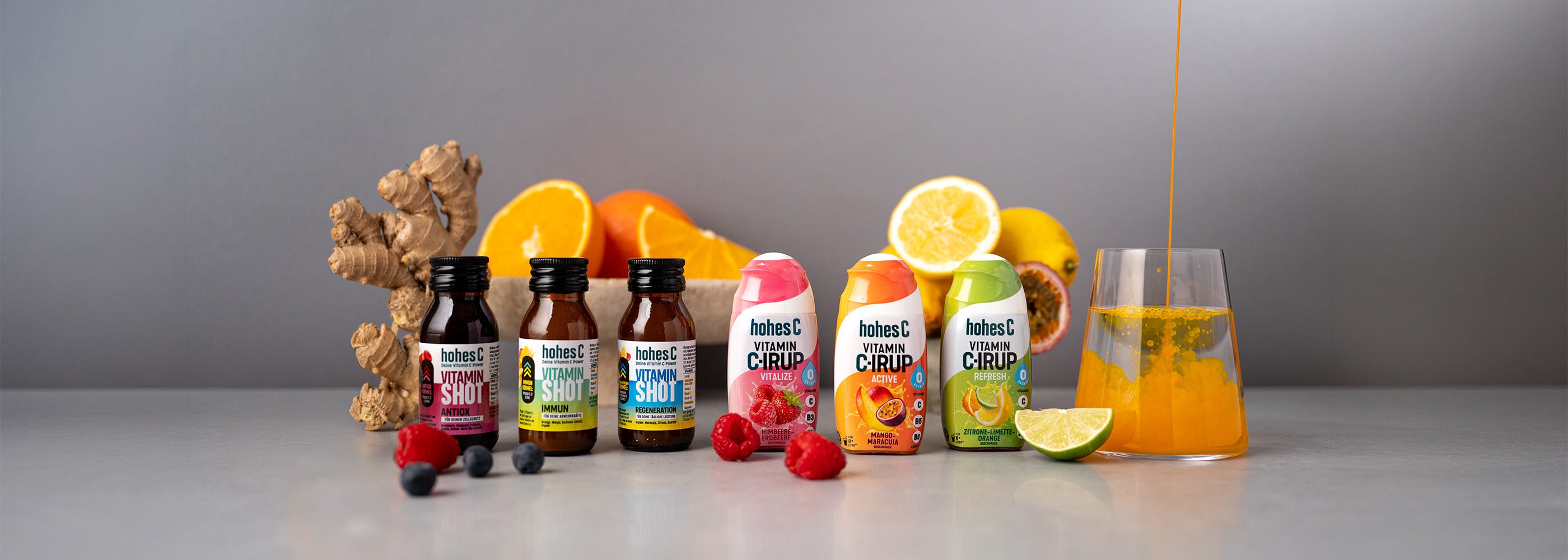 Mischung aus Mehrfruchtsaft aus Fruchtsaftkonzentraten, Frucht- & Ingwermark, Ingwerextrakt, Magnesiumcarbonat, Pantothensäre, Vitamin A und B12 und natürliches Aroma, pasteurisiert.